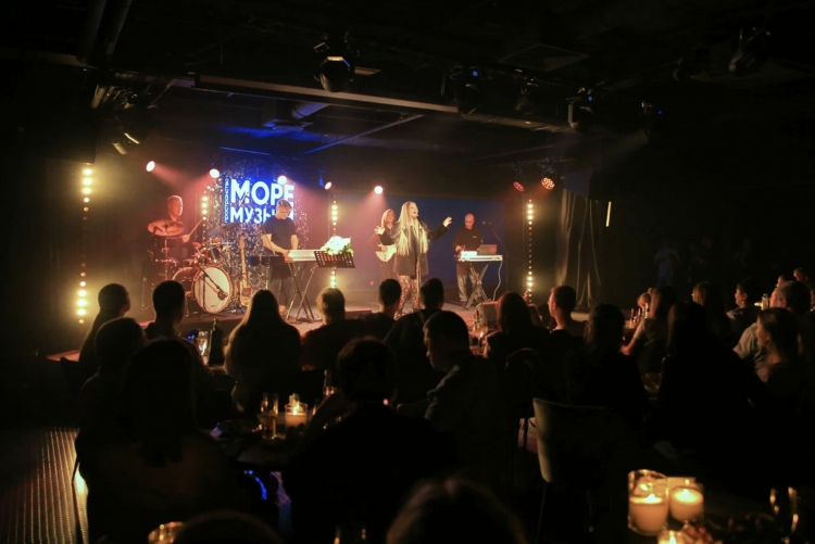 Атмосфера подводного мира, приглушенный свет и живая музыка в окружении морских обитателей и бликов воды.